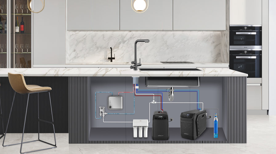 Elevate your home with this sleek Wintemp Under-Counter Water System, designed for modern kitchens that value both functionality and aesthetics. This integrated system combines a tankless electric water heater, advanced water filtration unit, and chiller, delivering purified hot and cold water on demand.